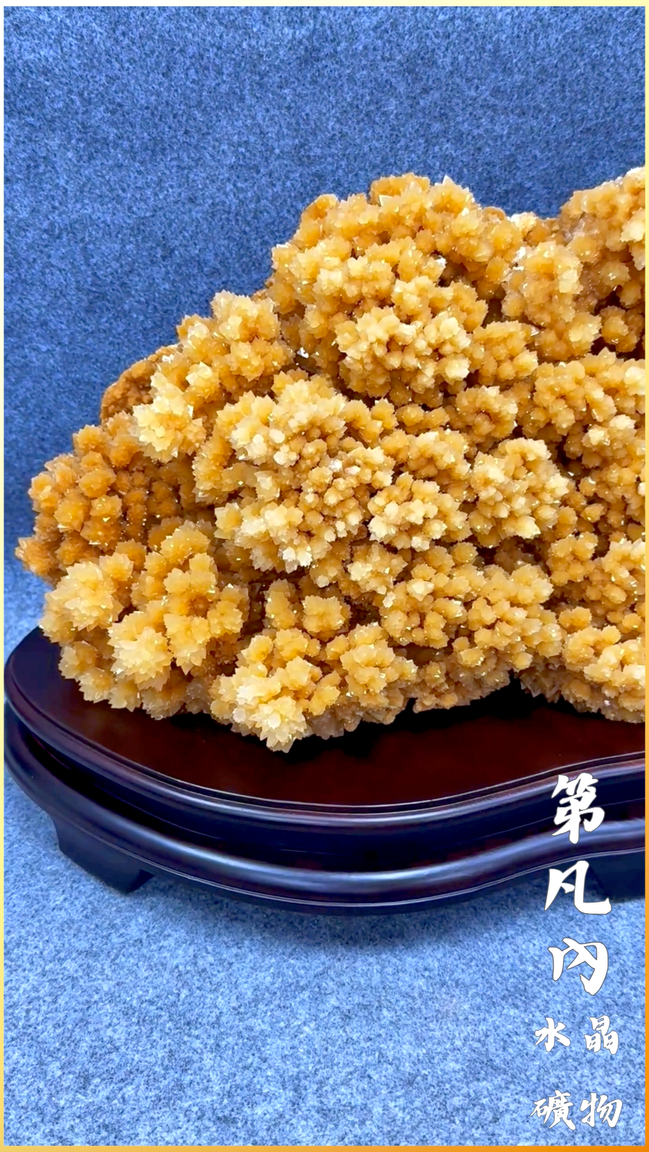 本件頂級的黃晶花方解石為世界罕有的立體花狀結晶,由於極特殊的高溫高壓環境導致成形過程中每個晶體都獨立成長,最後才聚合在一起,因此形成這樣獨特的花簇狀外觀,就如天女散花、錦簇花團一般,充滿大富大貴的頂級寓意,歡迎喜愛水晶寶石礦物的朋友親來參觀欣賞。