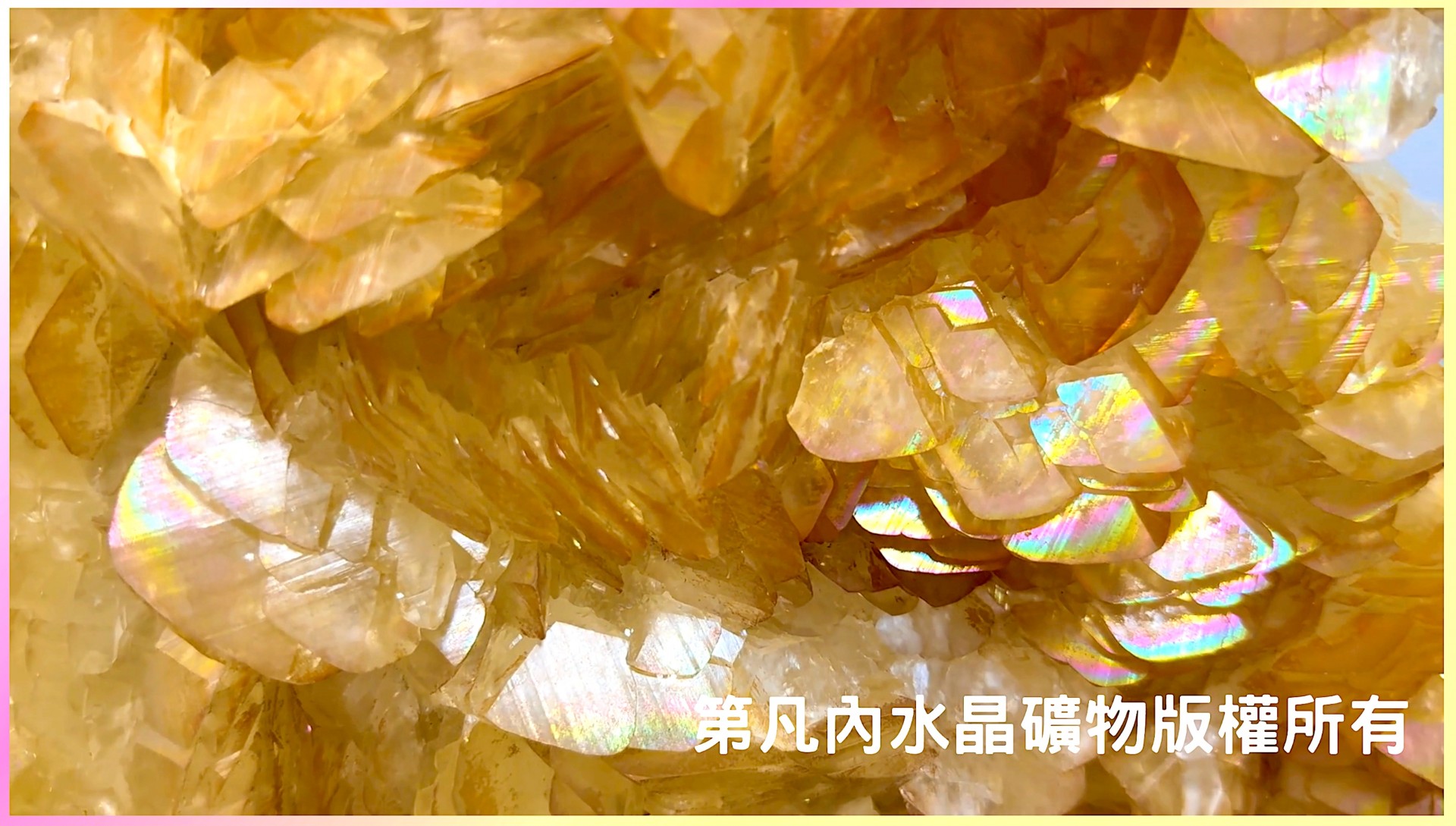 本件頂級的彩虹黃金方解石是寶石礦物中的極品,其整體皆是千層萬疊的片狀結晶,而顏色更因氧化鐵離子分布而呈現了太陽金、翠玉金到琥珀黃、威士忌黃的各種金黃色,部分晶體上更有炫麗的彩虹色反光,彷彿寓意著步步高昇、華貴非凡、富饒無比且人生彩色的頂級氣象,歡迎喜愛水晶寶石礦物的朋友親來參觀欣賞。